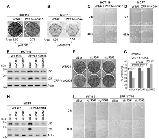 Decrease in cancer cell growth and migration upon ZFP14 KO is p53-dependent. (A,B) Isogenic control and ZFP14-KO HCT116 (clone #10) cells: (A) cells or isogenic control and ZFP14-KO MCF7 (clone #4) cells (B) were plated for clonogenic assays and grown for two weeks, followed by fixation and crystal violet staining. ColonyArea plugin in ImageJ was used to quantify the relative colony areas, which are shown below each image. (C,D) Wound-healing assay was performed with isogenic control and ZFP14-KO HCT116 (clone #10) cells (C) or isogenic control and ZFP14-KO MCF-7 (clone #4) cells (D) for a period of 48 h. (E) The levels of p53, p21 and actin proteins were measured by Western blotting in isogenic control and ZFP14-KO HCT116 cells transfected with scramble, p53 siRNA#1 or p53 siRNA#2 for 72 h. (F) The cells treated as in (E) were plated for clonogenic assays 48 h after transfection and, after two weeks, the colonies were fixed and stained with crystal violet. (G) ColonyArea plugin in ImageJ was used to quantify the relative colony areas from (F) and plotted as percentage colony area. The area of isogenic control cells transfected with control siRNA was set at 100%. (H) The levels of p53, p21 and actin proteins were measured by Western blotting in isogenic control and ZFP14-KO MCF7 cells transfected with control, p53 siRNA#1 or p53 siRNA#2 for 72 h. (I) 72 h after transfection, the cells treated as in (H) were subjected to wound-healing assays for 48 h.