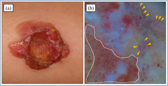 Clinical and dermoscopic findings. (a) A brown dome-shaped nodule of 30 × 35 mm is observed on the right thigh. The erythema around its margins is asymmetric. (b) Dermoscopic examination shows whitish globular structures (red dotted line). Polymorphous vessels with a whitish negative network on a light brown background are also observed (yellow arrowheads). The vessels are more conspicuous and irregularly shaped (white dotted line).