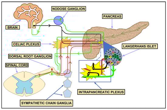 The pancreas is abundantly innervated by afferent and efferent nerve fibers, engaging both the autonomic and central nervous system. The extrinsic autonomic nerve fibers stem from the vagus nerve and providing sympathetic innervation splanchnic nerves, also carrying sensory nerve fibers from the dorsal root ganglion (DRG) and ganglia of the sympathetic chain. The head of the pancreas is believed to be the most innervated part of this organ [,]. Both parasympathetic and sympathetic innervations are likely to decrease from the head to the tail of the pancreas [,,].