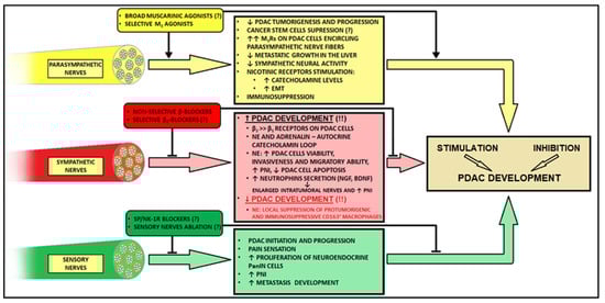 Chronic stimulation of the sympathetic nervous system was found to drive tumorigenesis and cancer progression via increased levels of catecholamines []. Surprisingly, parasympathetic nerves possess a presumably inhibitory role in PDAC and behave in an opposite manner to that observed in gastric and prostate cancers [,,,]. In PDAC, cholinergic nerves can inhibit the growth of cancer stem cells (CSCs) and have a suppressing influence on liver metastases []. Using drugs that block sympathetic and parasympathetic transmission could serve in favor of inhibiting tumor progression [,].