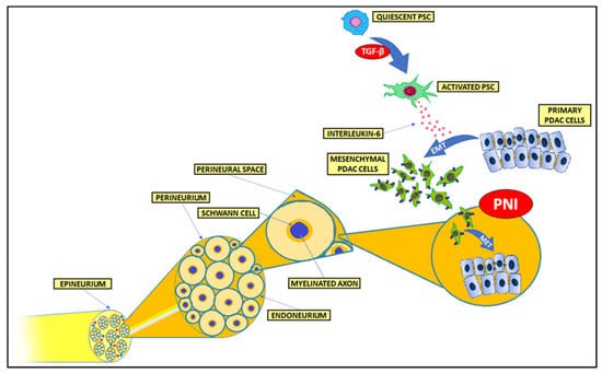 Among the various stromal cells, pancreatic stellate cells (PSCs) can be found in the exocrine regions of the pancreas []. PSCs occur in two main phenotypes: quiescent and activated. Quiescent PSCs play a role in maintaining a normal tissue architecture by regulating ECM turnover [], whereas activated PSCs’ role is multidimensional. In PDAC they contribute to desmoplastic stroma formation, as well as tumorigenesis and tumor progression [,,,]. Furthermore, PSC-derived IL-6 induces epithelial–mesenchymal transition (EMT) in a paracrine fashion via the STAT3/NRF2 pathway []. Interestingly, PSCs were found to co-travel with pancreatic cancer cells (PCCs) to form distant metastases [,]. In addition, it has been recently suggested that PSCs play an essential role in PDAC-related pain []. Novel findings show that PSCs via Sonic hedgehog and hepatocyte growth factor/c-Met signaling pathways promote PNI in PDAC by activating the mTOR/NGF axis [,,].