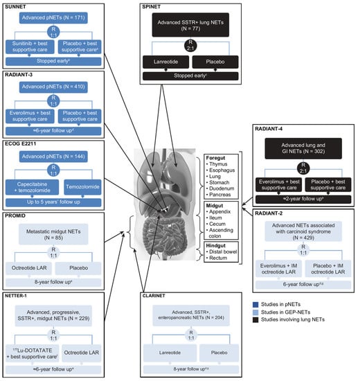 - Reidy-Lagunes, D.L.; Hörsch, D.; Singh, S.; Caplin, M.E.; Ferone, D.; Wolin, E.M.; Capdevila, J.; Buikhuisen, W.; Raderer, M.; Dansin, E.; et al. Lanreotide autogel/depot (LAN) in patients with advanced bronchopulmonary (BP) neuroendocrine tumors (NETs): Results from the phase 3 SPINET study. In Proceedings of the North American Neuroendocrine Tumor Society Virtual Multidisciplinary NET Medical Symposium, Virtual, 4–6 November 2021; Abstract C8. [Google Scholar]