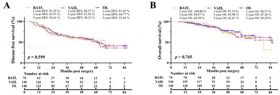 After PSM, the overall median postoperative follow-up was 41.5 months [interquartile range (IQR), 26.0–57.0 months]. For the RATL, VATL, and OL groups, the median follow-up was 39.5 months [IQR, 19.5–59.0 months], VATL 44.5 months [IQR, 30.0–56.0 months], and OL 42.0 months [IQR, 25.0–58.5 months], respectively. In the RATL, VATL, and OL groups, the 5-year DFS was 54.41%, 49.31%, and 51.44%, respectively, and the 5-year OS was 68.59%, 62.81%, and 66.24%, respectively (Figure 2A,B). The three surgical approaches were associated with the similar DFS (p = 0.599) and OS (p = 0.765) data. In addition, the subgroup analysis indicated no survival data difference among the RATL, VATL, and OL groups in terms of the tumor size (Figure 3A–D) and the pathological TNM stage (Appendix A, Figure A1A–D). Furthermore, multivariate Cox regression model analysis revealed that the operation approach was not individually associated with the DFS (Hazard Ratio (HR) = 1.008, p = 0.970; Table 5) or OS (HR = 0.855, p = 0.577), and receiving adjuvant therapy was independently associated with prolonged DFS (HR = 0.520, p = 0.012) and OS (HR = 0.405, p = 0.003). However, an increased metastatic number of LNs was the independent risk factor of poor DFS (HR = 0.268, p < 0.001) and OS (HR = 0.368, p < 0.001).