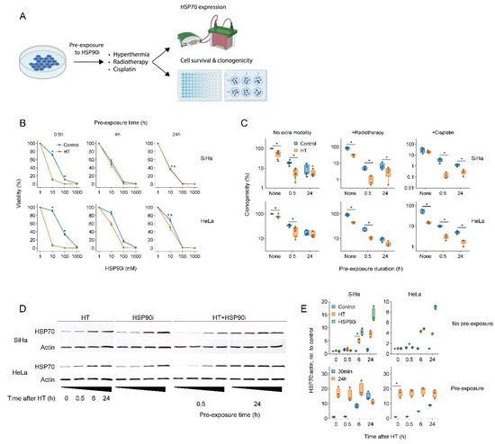 Short pre-exposure to ganetespib maximizes the radio- and chemo-sensitization by hyperthermia. (A) Experimental setup. Cervix cancer cells were pre-exposed to ganetespib (HSP90i) for different durations and treated with different combinations of hyperthermia (HT), 3.3 μM of cisplatin and 2 Gy of radiotherapy. (B) Cell viability 72 h after treatment with HT and HSP90i. Noteworthy significant differences are marked with an asterisk. Not significant: “n.s.”. (C) Effect of pre-exposure with 30 nM of HSP90i on the clonogenicity after radio- and chemo-thermotherapy. (D) Immuno-blot showing levels of HSP70 and beta-actin (loading control) at various time points after HT and HSP90i. The uncropped blots are shown in Figure S3. (E) quantification of (D).