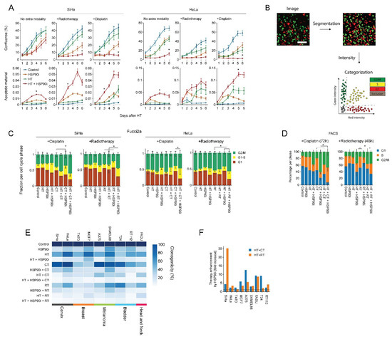 Ganetespib improves the efficacy of hyperthermia-based treatments in vitro. Cervix cancer cells were exposed to combinations of hyperthermia (HT), 30 nM of ganetespib (HSP90i), 2 Gy of radiotherapy (RT), and 3.3 μM of cisplatin (CT). (A) Cell growth and apoptosis were monitored and quantified over the course of six days with the IncuCyte S3 imaging platform. Noteworthy significant differences are marked with an asterisk. (B) Cell cycle analysis pipeline after radio- and chemo-thermotherapy using Fucci2a-transfected cervix cancer cells. Cells were imaged daily after treatment, and image segmentation was performed, followed by quantification of fluorescence intensities and thresholding to detect cells in the different phases of the cell cycle. Scale bar: 100 μm (C) Quantification of cell cycle distribution after radio- and chemo-thermotherapy 48 and 72 h after HT, respectively, based on the analysis of cells transduced with the Fucci2a reporter. (D) FACS-based cell cycle analysis at identical time points. Noteworthy significant differences between the percentage of cells in G1 are marked with an asterisk. (E) Heatmap showing clonogenicity after radio- and chemo-thermotherapy of a cancer cell line panel. (F) Enhancement ratio of chemo- and radio-thermotherapy outcomes in the presence of ganetespib, displayed as a fold-increase relative to the respective treatment without ganetespib. The horizontal dotted line marks no enhancement.