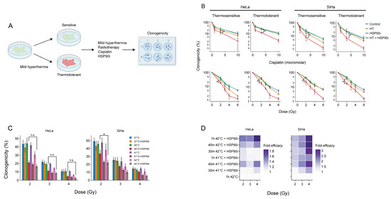 Ganetespib re-sensitizes thermotolerant cells and promotes the effects of hyperthermia-based treatments at lower thermal doses. (A) Experimental setup. Cervix cancer cells were rendered thermotolerant by hyperthermia (HT) treatment 24 h before exposure to 2 Gy of radiotherapy or 3.3 μM of cisplatin in the absence or presence of 30 nM of ganetespib (HSP90i). Clonogenicity was used as a readout for therapy efficacy. (B) Clonogenicity of control and thermotolerant cells after exposure to various chemo- and radio-thermotherapy regimens. Noteworthy significant differences are marked with an asterisk. Not significant: “n.s.”. (C) Clonogenicity after treatment with radio-thermotherapy at lower thermal doses, in the presence or absence of ganetespib. (D) Enhancement ratio of chemo- and radio-thermotherapy outcomes at lowered thermal dose in the presence of ganetespib, displayed as a fold-increase relative to the respective treatment without ganetespib. The horizontal dotted line marks no enhancement.