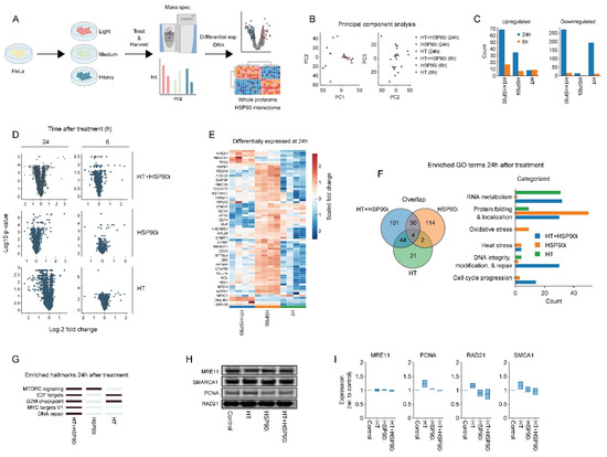 Proteome alterations caused by ganetespib and hyperthermia. (A) Experimental setup. The HeLa cells were labeled in SILAC media, exposed to combinations of 30 nM of ganetespib (HSP90i) and hyperthermia (HT), and processed for proteomics and downstream analysis. (B) Principal component analysis. (C) Number of up- and downregulated proteins (log2 fold change higher than 0.5 or lower than −0.5). (D) Volcano plots of all conditions. (E) Heatmap of proteins found to be up- or downregulated under at least one condition. Overrepresentation analysis on up- and downregulated proteins yielded results presented in panels (F,G). (F) Venn diagram and hand-curated categories of gene ontology (GO) terms found to be enriched per condition. (G) Heatmap displaying enriched hallmark gene sets (marked in dark blue). (H,I) Immuno-blots and quantifications showing the expression of proteins of interest 24 h after HT. Equal protein loading was ensured by a Lowry assay. The uncropped blots are shown in Figure S4.