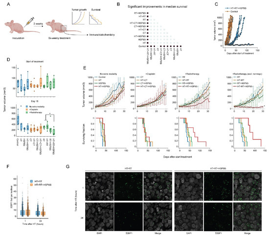 To validate the effects of combining ganetespib with hyperthermia in vivo, we used a cervix cancer mouse model. Briefly, 1 million SiHa cells were subcutaneously injected into the right hind leg of nude mice, which resulted in palpable tumors within approximately 14 days. Tumor volume, animal weight and survival were recorded during and after twice-weekly treatment regimens consisting of various combinations of cisplatin, radiotherapy, hyperthermia and ganetespib (Figure 6A). All treatments displayed minimal toxicity-related issues in pilot experiments, except for those where cisplatin and ganetespib were combined, and the dose of both drugs in these groups was reduced by 50%. We found that all modalities, apart from radiotherapy (p = 0.07), significantly improved tumor control and survival as a single agent (Figure 6B). Hyperthermia-based radio- and cisplatin therapy did not outperform the monotherapies, however, and the addition of ganetespib to hyperthermia did not result in an improved outcome. Notably, we found that the addition of ganetespib to a radio-thermotherapy regimen outperformed all other treatments in four out of six mice (Figure 6D,E), but the remaining two mice showed tumor growth and survival comparable to other treatment groups (Figure 6C). To evaluate whether this increased treatment efficacy can be attributed to the inhibition of DNA repair mechanisms, we performed an additional experiment in which we exposed mice to a single round of radio-thermotherapy in the presence or absence of ganetespib and evaluated the kinetics of foci formation by P53-binding protein 1 (53BP1), an important mediator in orchestrating the DNA damage response and repair pathway decision making [84,85]. We observed that the addition of ganetespib to radio-thermotherapy did not influence the amount of 53BP1 foci per cell, arguing that double-strand break repair is similarly affected at these timepoints in vivo. We concluded that ganetespib can enhance the effects of radio-thermotherapy in vivo, although the response was not uniform.