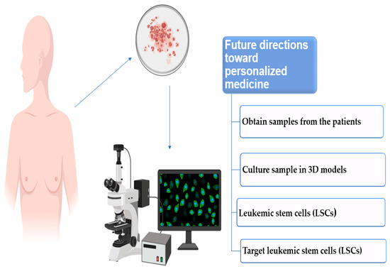 The integration of culturing LSCs in a 3D model can potentially take in vitro modeling a step closer to personalized medical plans. By designing 3D in vitro models that closely resemble the BM microenvironment, we can examine these cells and use this information to develop therapeutic plans specific to the phenotype of AML, with fewer side effects and more clinically efficient results. By initially obtaining samples from the patient’s BM and/or peripheral blood and isolating the nuclear cell component, we can subsequently test the isolated cells for their immunophenotype, metabolic patterns, and cellular signaling. This will be followed by culturing patients’ samples in in vitro 3D models that recapitulate BM microenvironmental interactions in order to cultivate and isolate LSCs. During and following culture, these samples could be investigated for specific LSCs cellular signaling pathways, survival mechanisms, and their interaction with the surrounding microenvironment. Identified signaling pathways will serve as potential targets for treatment plans and further provide us with evidence in terms of efficiency and chemoresistance. Furthermore, these newly discovered drugs can also be tested as a mono-therapeutic agent or in conjunction with conventional treatment plans for AML and LSCs cells simultaneously. Collectively, this approach can help us eradicate both AML and LSCs cells (Figure 1).