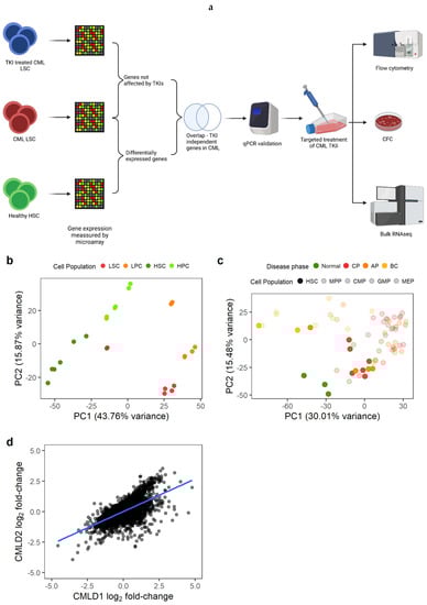 We first identified the genes that were differentially expressed (DE) between CML LSC and non-CML HSC (Figure 1a). We used two previously generated microarray datasets comparing non-CML to treatment naïve CML cells. As described in the methods section, CMLD1 [13] and CMLD2 [25] were generated using the same Affymetrix chips and the most primitive populations (HSC/LSC) were sorted for CD34+CD38− and CD34+CD38−CD90+, respectively. The first two principal components (PC) of CMLD1 showed a clear separation between CML and non-CML, as well as between stem (CD34+CD38−) and progenitor cells (CD34+CD38+), as expected (Figure 1b). The first two PC of CMLD2 showed non-CML HSC in a distinct position, while chronic phase (CP) CML and most accelerated phase (AP) CML LSC clustered with non-CML progenitors, suggesting that CP and AP CML LSC have a progenitor-like molecular phenotype (Figure 1c), as previously reported [34]. The blast crisis (BC) LSC and one AP LSC sample clustered together, as previously shown using scRNAseq [6]. When comparing CML LSC against non-CML HSC in CMLD1, we identified 4505 DE genes, while the same comparison in CMLD2 identified 2344 DE genes. In order to investigate only genes with a high confidence of being DE in CML LSC compared with non-CML HSC, we used the 1497 genes that were DE in both datasets. This overlap (or higher) was very unlikely to happen by chance (p < 0.001, hypergeometric distribution). Additionally, we investigated if the global changes in the transcriptome were conserved across datasets (Figure 1d). We found significant positive correlation (p < 0.001; R1d = 0.63; Pearson’s correlation).