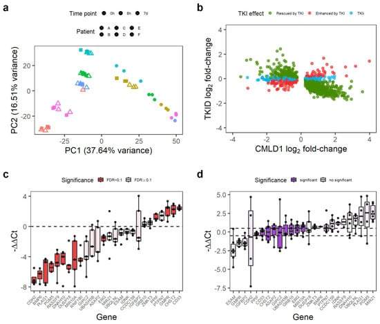 Then, we identified the genes not affected by the TKI treatment using the TKID dataset. TKID was generated with the same Affymetrix chips as CMLD1 and CMLD2 and contained the gene expression data of the treatment naïve chronic phase CML samples at baseline (CD34+CD38− cells) and after 7 days in vitro TKI treatment (7 d, CD34+ cells). The PCA suggests a strong patient effect (patients indicated by colour), with the cells treated with TKI for 7 d being different from the cells at baseline or the cells after early exposure (Figure 2a). As we were trying to identify the genes not affected by the TKI treatment (as a proxy for the genes independent from BCR-ABL1 TK), we decided to assess the TKI-independent (TKI-independent) genes using an equivalence test, as previously described [28]. As equivalence tests require a threshold or margin of equivalence to be set by the research team, we decided to use the expected technical variation. Thus, we calculated the log2 fold-changes of the technical replicates present in CMLD1 and TKID in order to identify the expected differences between the biologically identical samples. As a p-value threshold of 0.05 is commonly used as a reference for significant change, we selected the percentiles 2.5 and 97.5, as the threshold for change. These percentiles were −0.486 and 0.487 log2 fold-change, which we rounded to −0.5 and 0.5 for the remaining calculations. Thus, any log2 fold-change whose 95% confidence interval crossed zero and was contained within −0.5 to 0.5 was considered non-changing. We identified 4913 non-changing genes after 7 d of TKI treatment in vitro.