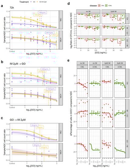 The GOIMGO regimen showed a similar trend, with both GO alone and in combination with IM having significantly lower EC50 in CML than in non-CML and within in vivo achievable concentrations (Figure 3b). EC50 in non-CML remained higher than the peak plasma concentrations in the patients.