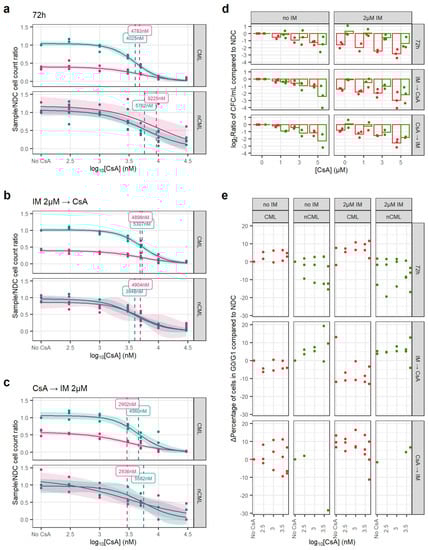 In all three regimens, the EC50 of CsA, either alone or in combination with IM, was similar, suggesting an effect independent of IM. However, CsA’s EC50 for CML and non-CML were similar at 3000–5000 nM and over the 1000 nM peak concentration usually achieved in clinical practice (Figure 4a–c) [38].