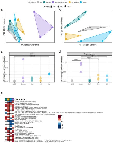 Targeting the TKIi signature alters the transcriptome of CML CD34+ cells. (a) PCA plot of all the samples sequenced. The transcriptomic changes caused by the GO + IM combination explain most of the variability of the dataset. (b) PCA plot after removing the GO + IM combination samples. This allows for a better understanding of the differences between the single treatments, which seem to be independent of each other (each treatment is projected in a different direction from the NDC). (c) Comparison of the HSC enrichment score generated by xCell for each sample. IM-treated samples were significantly enriched by HSC compared to the NDC (FDR < 0.01). (d) Comparison of the megakaryocyte enrichment score generated by xCell for each sample. The GO + IM was borderline significantly enriched on megakaryocytes compared either to the NDC or to GO/IM single treatment (FDR < 0.1). (e) Shortlist of the Reactome pathways significantly enriched in any of the conditions by GSEA. White squares represent non-significant pathways (independently of the enrichment score). Blue squares represent downregulated pathways, while red squares represent upregulated pathways. Full list of pathways can be found in Figure S8. (all) Each shape represents an individual patient, while each colour represents an individual treatment.