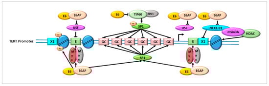 Telomerase was found expressed in all HPV-related tumors and the TERT level is proportional to the severity of the neoplastic grade in cervical lesions [60]. As shown in Figure 1, the HPV E6 oncoproteins are able to promote telomerase activity by multiple mechanisms involving the regulation of transcriptional, epigenetic and post-transcriptional processes [61,62,63]. Early studies showed that the expression of HPV16 E6 in early-passage human keratinocytes induced high levels of telomerase and that such effect was independent from the HPV E6/E6AP degradation of p53 [9,64]. Moreover, TERT levels and telomerase activity were significantly higher in human keratinocytes expressing both HPV E6 and E7 oncogenes compared to cells expressing HPV E6 alone [65]. The minimal E6-responsive region in the TERT promoter was found located within the 258-bp sequence, proximal to the ATG start site [65]. This region, defined as the TERT core promoter, contains several E-boxes/X-boxes and GC-boxes, which are cis-regulatory sequences preferentially bound by the transcription factors MYC/MAX/MAD1 and SP1, respectively [66,67]. Several studies have demonstrated that MYC can activate TERT expression through the formation of MYC/MAX heterodimers, which displace MAD1/MAX repressors on the E-boxes [21,68,69]. The E6/E6AP complex has been shown to cooperate with MYC in the stabilization of MYC/MAX heterodimers, which causes the shift of MAD1/MAX repressor and enhanced TERT transcription and telomerase activity [65,70,71,72,73]. The mutation of MYC-binding sites did not result in the complete abrogation of TERT expression, which was instead obtained by the disruption of both MYC- and SP1-binding sites. These results suggested a complex mechanism of E6-dependent TERT promoter activation involving a cooperative action of transcription factors binding simultaneously to the MYC and SP1 cis-elements [65,67].