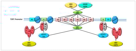 Two proteins encoded by HBV, namely HBx and surface (S) gene (preS2), have been shown to increase TERT expression and telomerase activity in hepatoma cells and in HCC cell lines, respectively [140,141]. In particular, wild type and truncated forms of HBx proteins have shown to increase telomerase activity and TERT expression in a dose-dependent manner in different HBx-transfected cells. The HBx responsive region has been localized in TERT core promoter (nt −132 to nt +5) and the HBx transactivation mechanism relies on its ability to stabilize SP1 to binding sites, as demonstrated by electrophoretic mobility shift assays [140]. HBx is highly expressed in HBV-related HCC biopsies and it is associated with increased transcription of TERT gene [140].