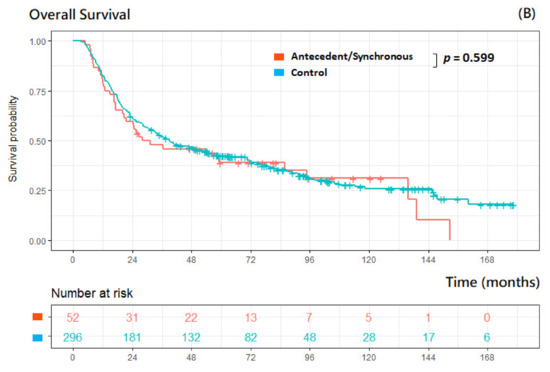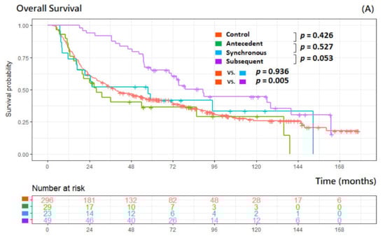 The 5-year OS rate was 44.6% in our cohort, 42.3% in the control group, 36.4% in the antecedent group, 41.7% in the synchronous group, and 65.2% in the subsequent group, respectively. The median observation time was 44.2 months (interquartile range (IQR): 17.7–81.6 months). There were no statistically significant differences in OS between the control, antecedent, and synchronous groups, and patients with subsequent cancers had significantly longer OS (p = 0.005) than did those without any MPCs (control group) (Figure 2A). There were no significant differences found (p = 0.599) between patients encountering antecedent/synchronous tumors initially and those with no MPCs (Figure 2B).