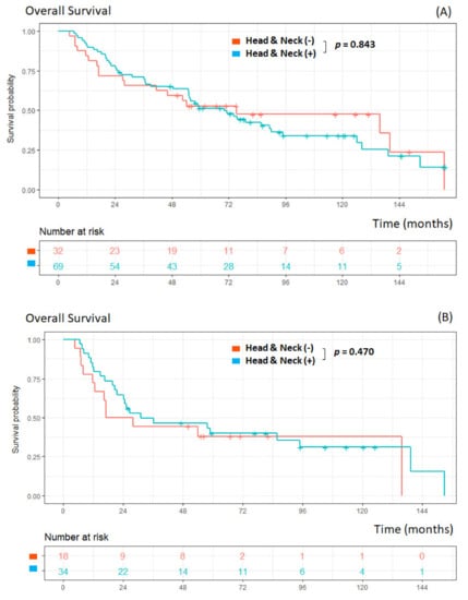 A total of 105 MPCs were observed in 101 patients (Table 3). Double primary cancers were identified in 97 patients, and triple primary cancers in four patients. The most frequently observed site of MPCs was the head and neck (65.7%, 69/105), followed by the liver (7.6%, 8/105) and lung (6.7%, 7/105). Of 101 patients with MPCs, patients associated with head and neck cancer (n = 69) did not have a significantly worse OS (p = 0.843) than did those without head and neck cancer (n = 32) (Figure 3A). Among those patients with antecedent or synchronous cancers, there was no statistical difference (p = 0.470) in the survival comparison between patients with head and neck cancer (n = 34) and those without (n = 18) (Figure 3B).