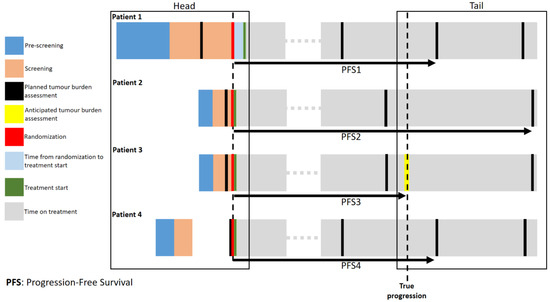 The differences between the PFSs depicted in Figure 1 can exceed 4–8 weeks. Therefore, large multicentre comparative trials reporting small, but statistically significant PFS differences are more prone to the effects of this “border-time” bias, which is not included in the stratified randomization procedure [6,7].