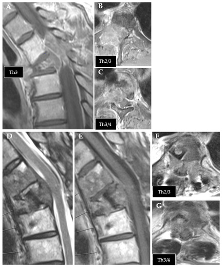 Exemplary case of tumor recurrence. (A–C): preoperative MRI of thoracic metastasis from urothelial carcinoma (T1 contrast enhanced). (D–G): follow-up MRI after CFR-PEEK instrumentation showing tumor recurrence ((D): T2; (E–G): T1 contrast enhanced).