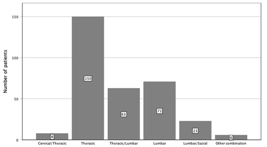 Advances in screening methods and new therapeutic options, in particular the implementation of targeted therapies, have lead to a continuous decline in cancer death rates, especially over the last ten years [7]. Due to improvements of the treatment protocols of many cancer types, above all, cancer of the hematopoietic and lymphoid system has become a “chronic disease” with a nearly normal life expectancy [7]. As a consequence, the number of patients with SM is increasing [8]. This leads to a change of mindset, calling for new therapeutic strategies when treating spinal tumors and metastases to guarantee a maximum of independent life for these patients. While SMs are the most frequent neoplasms of the spine, being found in about 15–35% of cancer patients [8,9] primary bone tumors of the spine are rare (less than 5% of spinal neoplasms) [10]. Treatment decisions are made interdisciplinary and individually, taking into account the patient’s symptoms, the degree of osteolytic instability, the degree of epidural compression, the radio- and chemosensitivity of the tumor and the overall prognosis [4,11].