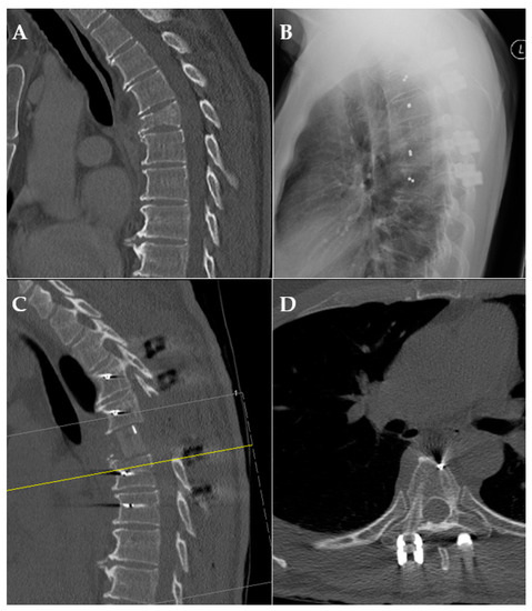 Exemplary case of pre-/postoperative CT scan and X-ray. (A): preoperative CT scan of a pathological fracture of the thoracic spine; (B): X-ray after posterior fusion; (C,D): CT scan after posterior fusion and anterior reconstruction demonstrating radiolucency.