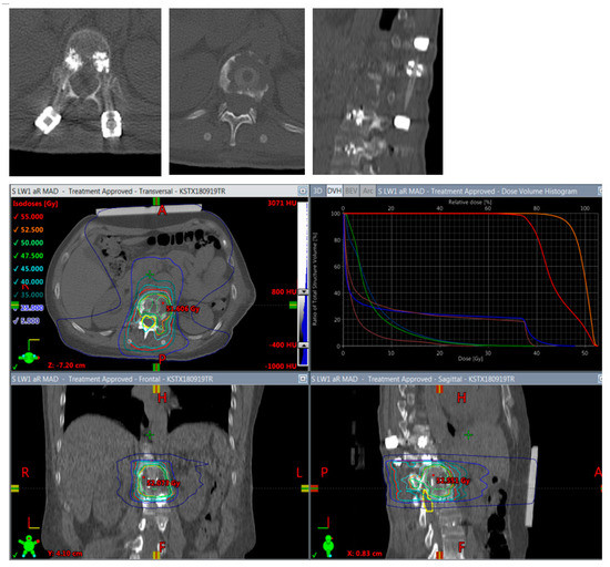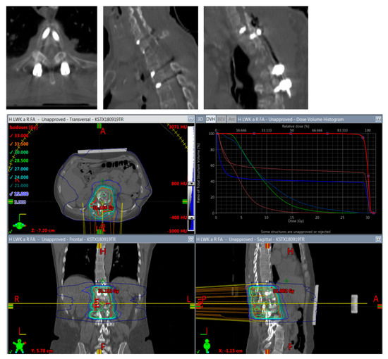 - Boriani, S.; Tedesco, G.; Ming, L.; Ghermandi, R.; Amichetti, M.; Fossati, P.; Krengli, M.; Mavilla, L.; Gasbarrini, A. Carbon-fiber-reinforced PEEK fixation system in the treatment of spine tumors: A preliminary report. Eur. Spine J. 2018, 27, 874–881. [Google Scholar] [CrossRef]