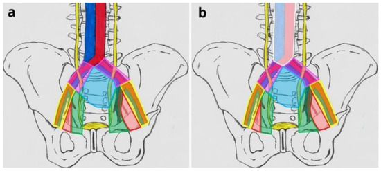 The anatomical diagram of PLND divided into templates: (a)—extended, and (b)—super-extended; the obturator fossa (red), external iliac vessels (yellow), internal iliac vessels (green), common iliac vessels (pink), the presacral area (blue), and the paraaortic/paracaval area (white).