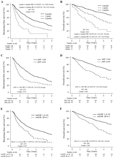For comparison to our preoperative staging system, Kaplan–Meier curves for RFS and OS based on serum AFP levels and mALBI grade are presented in Figure 1C–F. The 1-, 3-, and 5-year RFS rates of the groups were significantly different, at 75.8%, 45.9%, and 30.1%, respectively, for AFP < 100 ng/mL and 49.9%, 28.1%, and 21.4%, respectively for AFP ≥ 100 ng/mL (<100 versus ≥100 groups: p < 0.001; Figure 1C), and the 1-, 3-, and 5-year OS rates of the groups were significantly different, at 91.7%, 75.1%, and 62.6%, respectively, for AFP < 100 mg/mL and at 78.8%, 50.9%, and 37.2%, respectively, for AFP ≥ 100 ng/mL (<100 versus ≥100 groups: p < 0.001; Figure 1D). The 1-, 3-, and 5-year RFS rates of the groups were significantly different, at 73.2%, 46.5%, and 32.1%, respectively, for mALBI 1 or 2A and at 56.2%, 22.5%, and 10.1%, respectively, for mALBI 2B or 3 (1 or 2A versus 2B or 3 groups: p < 0.001; Figure 1E), and the 1-, 3-, and 5-year OS rates of the groups were significantly different at 91.1%, 73.4%, and 62.2%, respectively, for mALBI 1 or 2A and at 79.4%, 53.4%, and 33.5%, respectively, for mALBI 2B or 3 (1 or 2A versus 2B or 3 groups: p < 0.001; Figure 1F).
