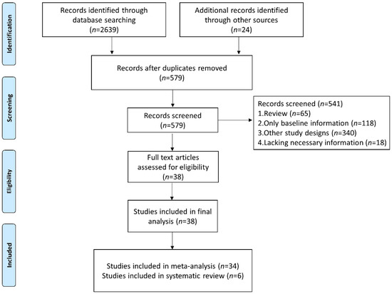 We identified 2663 studies in the database searches, and we excluded 2084 duplicated articles. After analysis of the title, abstract, and topic, 541 other articles were excluded (Figure 1). Finally, 38 studies were included (34 studies were included in the meta-analysis for quantitative analyses and 6 studies were included in the systematic review to analyze the dynamics of NLR level in patients without or with response to immunotherapy).