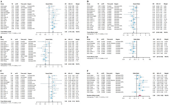 Twenty studies (Sekine et al. reported two independent cohorts) [8,18,20,21,22,23,26,28,29,30,33,40,44,45,46,47,48,50,52,54] including 2494 patients reported the association between PFS and the change in NLR after immunotherapy. Fifteen studies [8,18,20,21,23,26,29,30,33,40,44,46,47,50,54] reported the association between the increase in NLR after ICI treatment and PFS. The pooled HR from a fixed effects model was 1.89 (95%CI: 1.66–2.14, p < 0.001, I2 = 37%, Figure 2C). Fourteen studies (15 cohorts) [20,21,22,28,29,30,33,40,44,45,47,48,52,54] reported the association between the increase in NLR after ICI treatment and PFS. There was low heterogeneity (I2 = 2%) in these studies, and a fixed effects model indicated that the decrease in NLR was associated with longer PFS (pooled HR: 0.57, 95%CI: 0.50–0.65, p < 0.001, Figure 2D).
