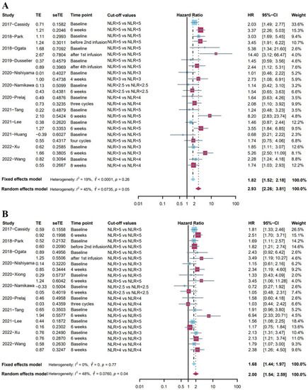 Among the previous studies, a considerable number of studies have demonstrated the negative impact of the elevation of the baseline (pre-treatment) NLR on the prognosis. Next, we compared the impact of NLR at baseline and after treatment on prognosis, based on those studies that gave both time points at the same time (Table S3).