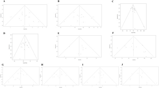 (A) Funnel plot for the association between upward trend in NLR after ICI treatment and OS. (B) Funnel plot for the association between downward trend in NLR after ICI treatment and OS. (C) Funnel plot for the association between upward trend in NLR after ICI treatment and PFS. (D) Funnel plot for the association between downward trend in NLR after ICI treatment and PFS. (E) Funnel plot for the association between upward trend in NLR after ICI treatment and ORR. (F) Funnel plot for the association between downward trend in NLR after ICI treatment and ORR. (G) Funnel plot for the association between high level of baseline NLR and OS. (H) Funnel plot for the association between high level of post-treatment NLR and OS. (I) Funnel plot for the association between high level of baseline NLR and PFS. (J) Funnel plot for the association between high level of post-treatment NLR and PFS.