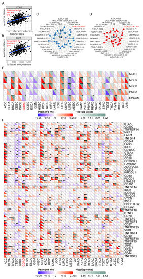 Relationship between CXCL8 and stromal score, ESTIMAT immune score, TMB, MSI, mismatch repair gene and immune checkpoints. (A) Relationship between CXCL8 and stromal score. (B) Relationship between CXCL8 and ESTIMAT immune score. (C) Relationship between CXCL8 and TMB. (D) Relationship between CXCL8 and MSI. (E) Relationship between CXCL8 and mismatch repair gene. (F) Relationship between CXCL8 and immune checkpoints. The caption for the red font is COAD. * p < 0.05, ** p < 0.01, *** p < 0.001.