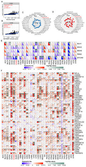 Relationship between LSECtin and stromal score, ESTIMAT immune score, TMB, MSI, mismatch repair gene and immune checkpoints. (A) Relationship between LSECtin and stromal score. (B) Relationship between LSECtin and ESTIMAT immune score. (C) Relationship between LSECtin and TMB. (D) Relationship between LSECtin and MSI. (E) Relationship between LSECtin and mismatch repair gene. (F) Relationship between LSECtin and immune checkpoints. The caption for the red font is COAD. * p < 0.05, ** p < 0.01, *** p < 0.001.
