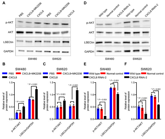 AKT/LSECtin is the downstream of CXCL8 in colon cancer. (A) Western blot was used to detect the expression of p-AKT, AKT and LSECtin in colon cancer cells after pretreated with CXCL8 (100 ng/mL). (B,C) Semi-quantitative analysis results of (A). (D) Western blot was used to detect the expression of p-AKT, AKT and LSECtin in colon cancer cells after pretreated with CXCL8 siRNA. (E,F) Semi-quantitative analysis results of (D). The uncropped blots are shown in Supplementary Material.