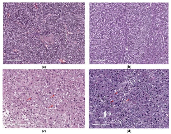 Hematoxylin and eosin staining of samples of conventional (a,b) and oncocytic (c,d) histological variants of ACC. Red arrows indicate the representative oncocytic cytology characterized by an abandoned granular eosinophilic cytoplasm.