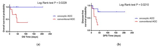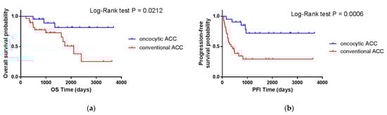 The analysis of the prognosis for patients with conventional and oncocytic ACC revealed significant differences between the two given groups in both cohorts of this study. Figure 2 and Figure 3 shows the Kaplan–Meier curves for overall (OS) and progression-free (PFI) survival for the TCGA cohort and overall (OS) and disease-free (DFS) survival for the ERC cohort, respectively, which clearly demonstrate this difference. The differences in survival between conventional and oncocytic histological variants of ACC were statistically significant (p-value < 0.05).