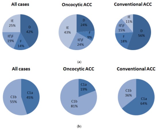 TCGA ACC can be also classified into steroid-low/immune-high (C1b) and steroid-high (C1a) clusters, according to Zheng et al. [40]. We demonstrated that the distribution of these two tumor classes differed between conventional and oncocytic ACC, and the immune-high group was predominant in oncocytic ACC (Figure 4b).