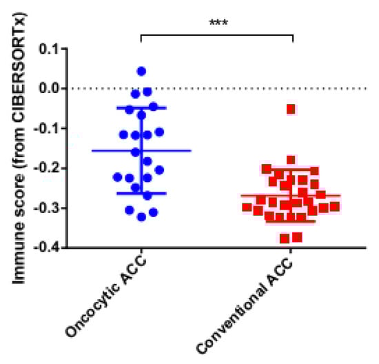 For additional analyses, we used the immune score parameter from the CIBERSORTx algorithm [33] to assess the intensity of the immune infiltration. The same result was obtained: the oncocytic variant of ACC was significantly and strongly infiltrated by immune cells, compared to conventional ACC (Figure 5).