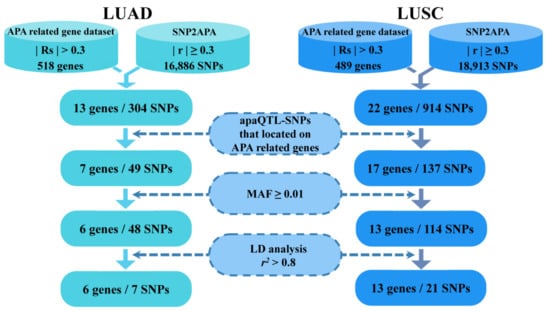 After obtaining apaQTL-SNPs in APA-related LUAD and LUSC genes, the candidate apaQTL-SNPs were then filtered out with a minor allele frequency (MAF) of ≥0.01 in the East Asian population (including the Chinese Han population, Southern Han Chinese population and Japanese population). Finally, the linkage disequilibrium (LD) analysis with an r2 threshold of 0.80 was performed to further filter above the apaQTL-SNPs (Figure 1).