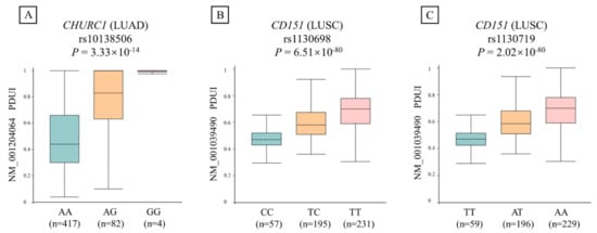 We further evaluated the relationship between the identified apaQTL-SNP rs10138506 and PDUI values of CHURC1 in LUAD. As shown in Figure 2, the apaQTL-SNP rs10138506 was significantly correlated with the PDUI values of CHURC1 (p = 3.33 × 10−14). In detail, compared with those of the wild-type homozygote AA genotype, the PDUI values of the heterozygous AG genotype in rs10138506 were significantly higher, whereas those of the variant homozygous GG genotype were even higher.