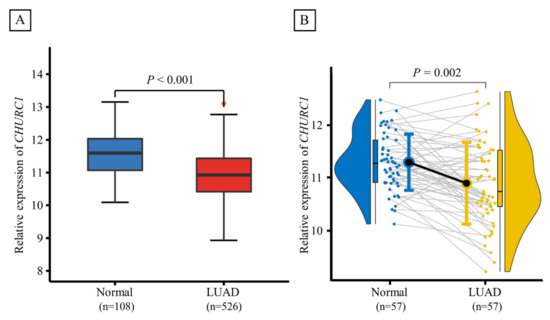 Based on TCGA database, the CHURC1 expression between LUAD tumor tissues (n = 526) and adjacent non-tumor tissues (n = 108) was significantly different (p < 0.001), and lower CHURC1 expression levels were found in tumor tissues. Furthermore, CHURC1 expression levels in 57 LUAD paired samples were also analyzed, and the results showed that CHURC1 expression in LUAD tumor tissues was significantly lower than that in the adjacent non-tumor tissues (p = 0.002) (Figure 3A,B).