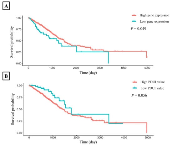The LUAD survival time curves for CHURC1. (A) Survival analysis of CHURC1 expression. (B) Survival analysis of PDUI value of CHURC1. LUAD, lung adenocarcinoma; PDUI, percentage of distal poly(A) site usage index.