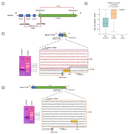Bioinformatic analysis indicated that different genotypes of apaQTL-SNP rs10138506 may affect the usage of different poly(A) sites in CHURC1, resulting in changes in PDUI values. Then, the predicted poly(A) sites of CHURC1 were identified in the NCBI database (https://www.ncbi.nlm.nih.gov/ accessed on 16 February 2022), and CHURC1 3′RACE was performed and verified using the mRNA from the A549 cell line. These results indicated that CHURC1 has two poly(A) sites that may produce two mRNA transcripts with different 3′UTR lengths. The distance between the proximal and distal poly(A) sites was approximately 2.7 kb. Meanwhile, SNP rs1127968 was found with a perfect high LD with rs10138506 (r2 = 1), which was located in the 3′UTR of CHURC1 and was approximately 0.2 kb away from the poly(A) site1 (Figure 5A). Meanwhile, the APA regulation for rs1127968 was the same as that for rs10138506 (Figure 5B). For the shorter CHURC1 mRNA isoform, the adopted PAS signal AAUACA is located at 39 bp upstream of the poly(A) site1, and the band of the PCR product (~420 bp) was consistent with the designed sequences (Figure 5C). For the longer CHURC1 mRNA isoform, the adopted PAS signal UUUAAA was located at 115 bp upstream of the poly(A) site2, whereas the band of the PCR product (~560 bp) was consistent with the designed sequences (Figure 5D). Finally, PCR product sequences were aligned to the transcript reference sequences from the NCBI database. Results showed that the 3′UTR transcript sequences with different CHURC1 lengths matched with the target region.