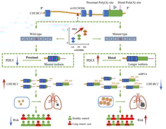 The 3′UTR contains various regulatory elements, including miRNA binding sites, which play a significant role in the expression level and translation ability of their target genes. Changes in the 3′UTR length of mRNAs mediated by APA events may affect the existence of miRNA binding sites, which may in turn affect the target genes [40,41]. Several potentially conserved binding sites in the 3′UTR of CHURC1 were further identified using Targetscan (http://www.targetscan.org/vert_71/ accessed on 18 April 2022). The results showed that both miR-4262 and miR-181b-5p were identified as potential CHURC1 regulators. Previous studies reported that miR-181b-5p may play a regulatory role in LUAD, which was down-regulated in LUAD [42]. Furthermore, miR-4262 was significantly down-regulated in gastric cancer tissues, and its lower-level expression was associated with a poorer prognosis and lower survival rate in patients with gastric cancer [43]. Taken together, we hypothesized that the variant G allele of rs10138506 could influence the APA events through its high LD SNP rs1127968, thereby making the 3′UTR expression longer in CHURC1 mRNA. Changes in the 3′UTR length of mRNA yield the enrichment of miRNA binding in the 3′UTR of CHURC1 and may, therefore, inhibit the CHURC1 expression in LUAD and elevate the risk of developing LUAD (Figure 6).