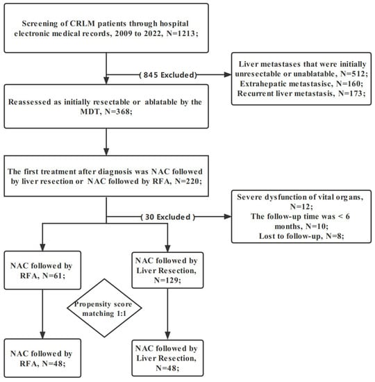 Herein, this research performed the retrospective comparative analysis for CRLM patients. All liver metastases were confirmed pathologically as CRLM by liver biopsy during the treatment. Imaging data of these patients were reassessed by a multidisciplinary team (MDT) prior to NAC. All cases underwent NAC (followed by hepatectomy or RFA) at Zhejiang Cancer Hospital from January 2009 to January 2022. These initially locally curable CRLM patients undergo NAC and locally curative treatment (liver resection or RFA only). According to the results of the MDT, locally curable is considered to refer to the following three points: liver resection or RFA is technically feasible; the patient’s physical condition meets the surgical requirements (the performance status of all CRLM patients is 0–1); it was ensured that all operating requirements were met in accordance with guidelines and consensus [,,], and patients provided informed consent. The primary sites of all cases had been radically resected. The first choice in the NAC followed by RFA group was not ablation (but surgical resection) in this study. The MDT and the patients negotiated to choose RFA for various reasons after NAC.