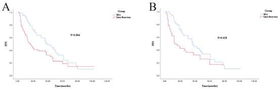 Kaplan–Meier survival curve for PFS of RFA and liver resection groups. (A): Unmatched analyses; (B): PSM analyses.