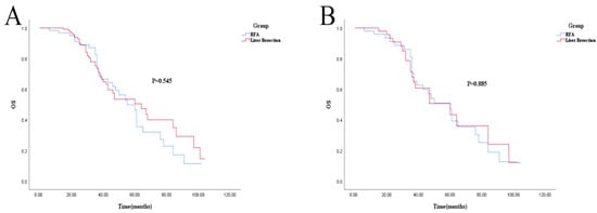 For OS, there was no statistical difference (log-rank; p = 0.545 and p = 0.885). The 1-, 3-, and 5-year OS in the liver resection and RFA groups was 100% vs. 96.7% (p = 0.191), 73.8% vs. 73.6% (p = 0.660), and 50.5% vs. 46.2% (p = 0.212), respectively. After PSM, 1-, 3-, and 5-year OS was 100% vs. 95.8% (p = 0.475), 67.9% vs. 70.4% (p = 0.811), and 43.4% vs. 47.1% (p = 0.399), respectively (shown in Figure 3A,B). Cox regression analysis also showed no difference in OS between the RFA and liver resection groups (Table 5).