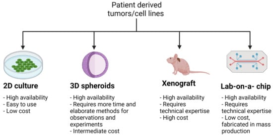 Summary of patient derived tumor models and cell lines. Various models of cancer are in use, each with their own applications, advantages, and disadvantages. 2D cultures are a widely used model for understanding cell biology and tissue morphology, as well as mechanisms of disease progression and actions of drugs [31]. Their high availability, ease of use, and low cost allow for high throughput data collection, although data from 2D cell lines alone is usually insufficient without further studies that more closely mimic in vivo conditions. 3D models, such as organoids and spheroids, overcome the 2D model’s limitation of monolayer cell culture, and thus obtain a more accurate physicochemical environment that compares to in vivo conditions [32]. This comes with the disadvantage of requiring more time and more elaborate methods for observations and experiments compared to 2D cultures, as well as a higher cost. However, 3D models do not require the same level of time and technical expertise as xenograft models, nor do they require the use of immunocompromised mice. The major advantage of xenograft models is that, compared to 2D and 3D models, they are the most comparable to in vivo physiology, permitting more accurate analysis of molecular, mechanistic, and drug screening studies. Lastly, lab-on-a-chip models are novel devices that integrate laboratory studies onto a very small, single, integrated circuit, allowing for high throughput screening [33]. As they are fabricated in mass production [34], lab-on-a-chip models have a high availability and low cost. Tumor-on-a-chip or organ-on-a-chip models are currently being developed to perform drug screening studies and better emulate physiologic conditions [35]. Created with BioRender.com.